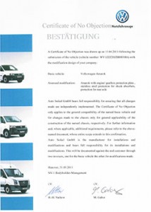 The Certificate Of No Objection (CNO) from Volkswagen Commercial Vehicles confirms that Volkswagen Commercial Vehicles has no objection to this conversion, provided it is fitted properly.