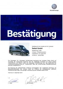 Die Unbedenklichkeitsbescheinigung (UBB) von Volkswagen Nutzfahrzeuge bestätigt, dass seitens Volkswagen Nutzfahrzeuge, bei sachgerechtem Einbau, keine Bedenken gegen diesen Umbau bestehen.