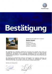 Die Unbedenklichkeitsbescheinigung (UBB) von Volkswagen Nutzfahrzeuge bestätigt, dass seitens Volkswagen Nutzfahrzeuge, bei sachgerechtem Einbau, keine Bedenken gegen diesen Umbau bestehen.